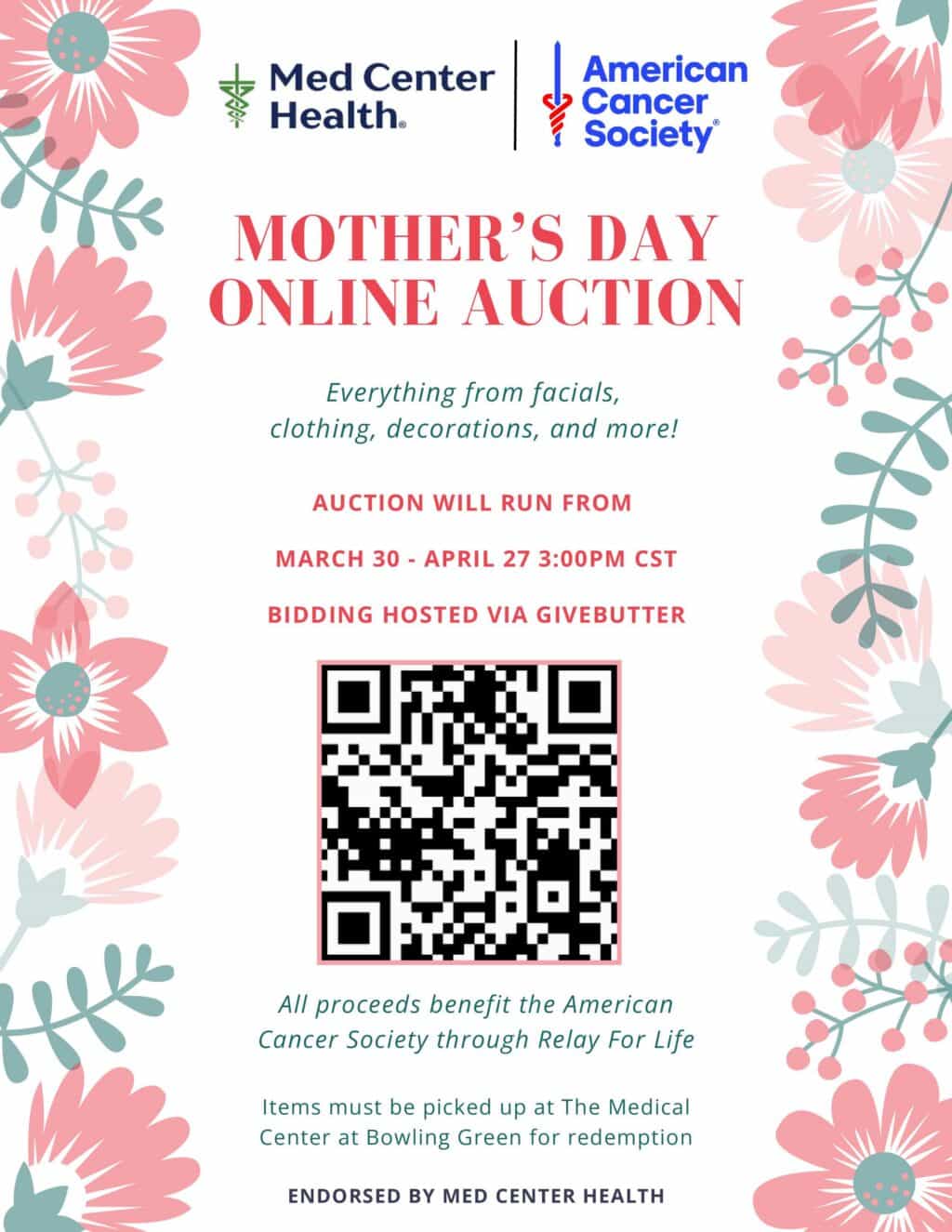 Med Center Health’s Relay for Life team is hosting a Mother’s Day Online Auction from now until April 27. All proceeds benefit the American Cancer Society through Relay for Life. Additional information and a QR code to the online auction can be found below.
